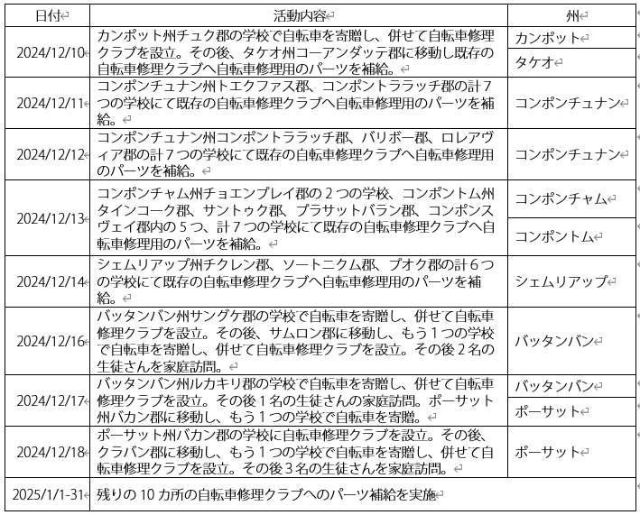 2024年にお申込み・ご協力いただきましたカンボジア自転車プロジェクト2024が現地の活動を終えました。プロジェクトの詳しい内容はホームページ( http://cam-bi.net/prj2024/ )に掲載しております。是非ご覧ください。
