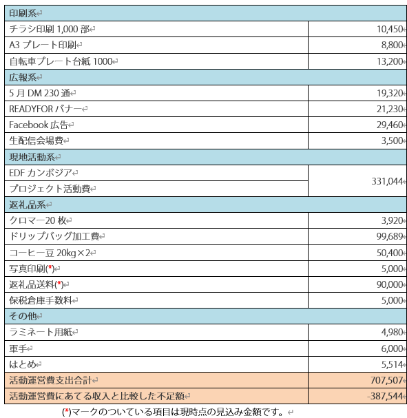これ以外に安田のカンボジア渡航費(飛行機代 85,710円、ホテル代 32,316円、ビザ取得 5,544円、SIMカード 5,782円 合計:129,352円)はプロジェクトとは関係のない活動も行ってまいりましたので滞在中の活動日以外の食費やその他の支出も含めましして例年通り自費として支出しております。