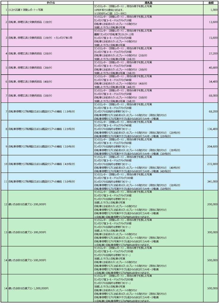 返礼品は、サンクスレター(活動レポート)、現地の様子を表した写真、カンボジア産コーヒードリップバッグ(設置個所数×20個)、カンボジアの伝統的な巻物「クロマー」、自転車修理クラブにお名前の入ったプレートの取り付け(現地に取り付け)(1~5か所分)、自転車修理クラブの写真や子ども達からのありがとうメッセージ動画(1~5か所分)となります。