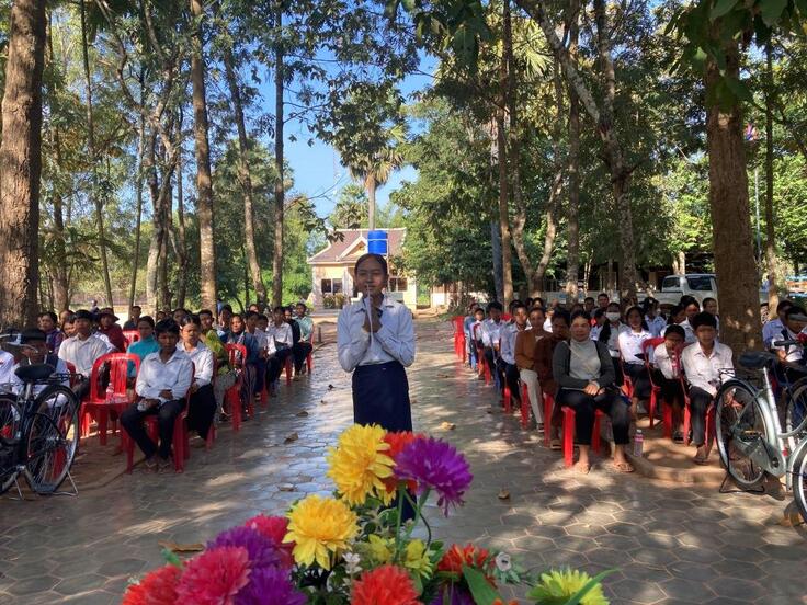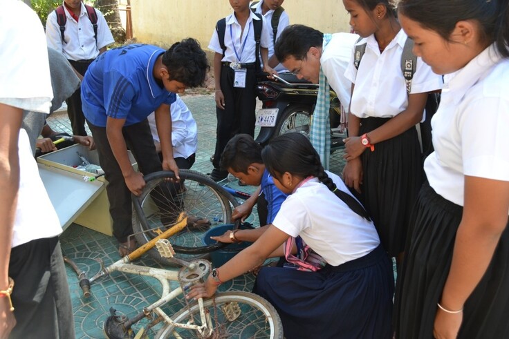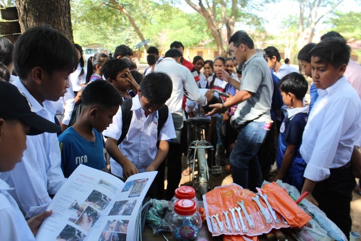 上の写真はコンポントム州のPREV PREAL中学校に自転車修理クラブを設立した時の様子です。クラブの設立前には自転車寄贈のセレモニーが行われました。