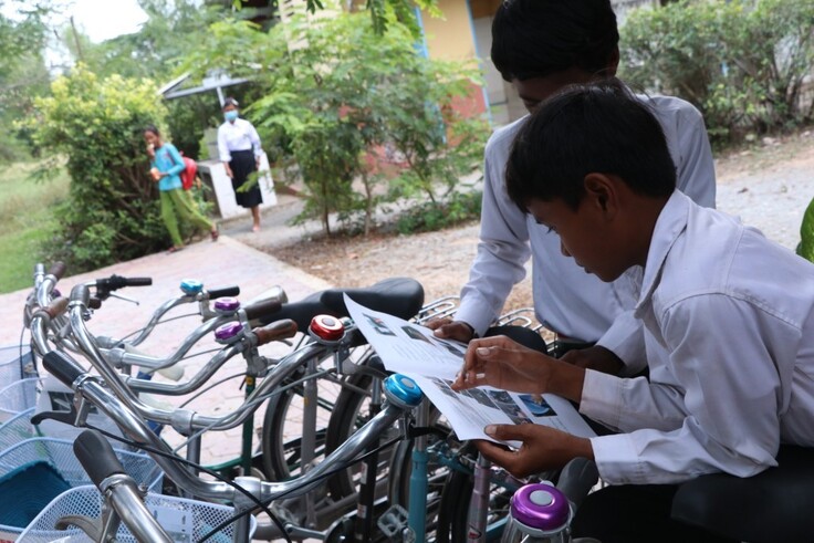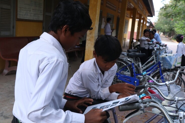 こちらの写真はシェムリアップ州のSOR SOR SDOM中学校での1枚。贈られた自転車と自転車修理マニュアルを楽しそうに眺める2名の男子生徒。