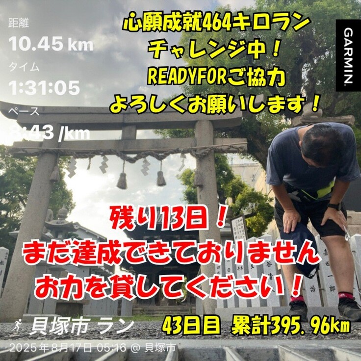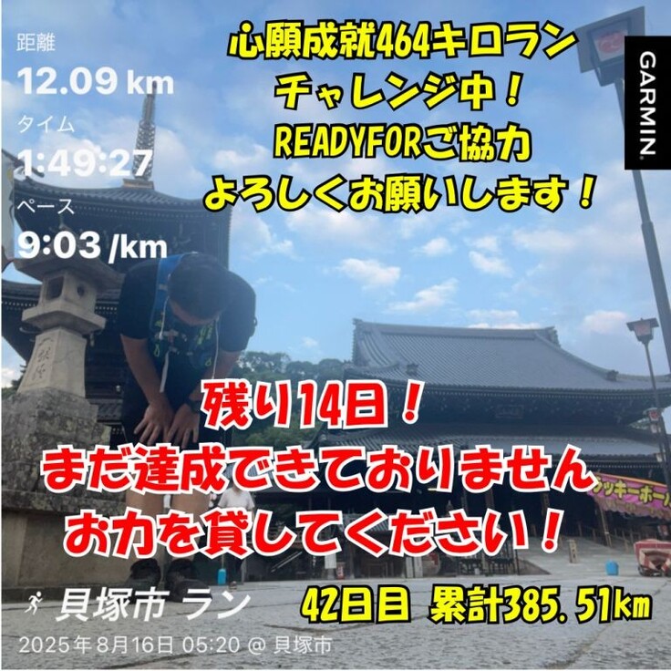 現在、クラウドファンディングの募集期間(〜8月30日)中に、プロジェクトの成功を願ってチャレンジしていることがあります。それが「464キロランニング」と「15キロダイエットチャレンジ」です🔥