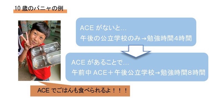 そこでACEはスラム街に学校を建て、スラムの子供達に勉強の機会を与えています。