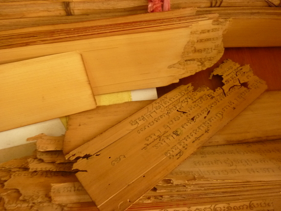 (僅かに残るヤシ科の葉に記録された伝統薬資料も劣化が激しい)