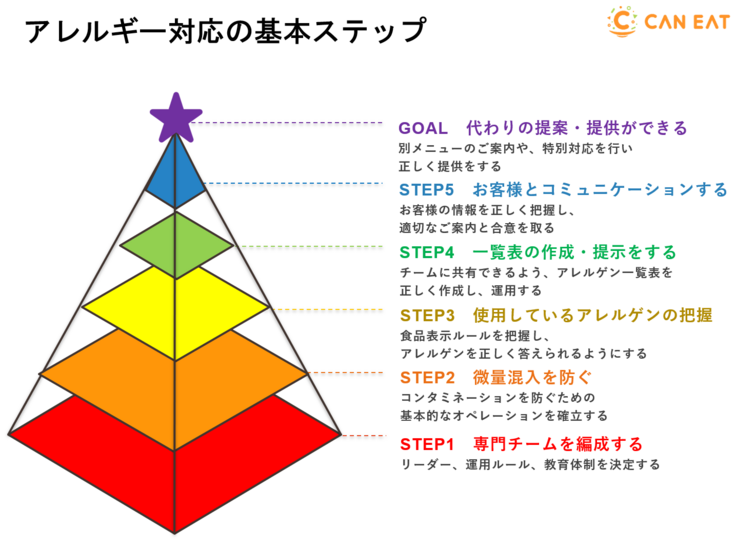 事業者が学ぶべきアレルギー対応の手順を体系化し、ひとつひとつの項目に対して詳しく解説しています。