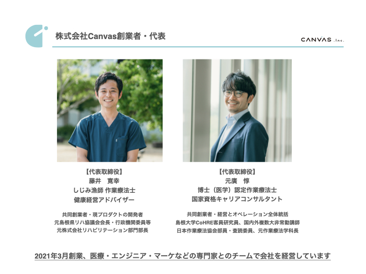 私たちは「株式会社Canvas」という中小企業が産業の中心である「島根県から生まれたヘルスケアベンチャー」です。共同創業者は2名で、主に医療・福祉・教育・研究などの様々な領域で仕事をしてきたメンバーです。現在はそのほかにも様々な属性(医療従事者、研究者、マーケター)のメンバーが会社に参画をしてくださっています。