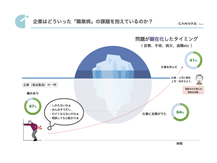事実、私たちが関わってきた複数の会社では80%以上の従業員が身体の問題を持ち、かつ「職業病だから仕方がない」と誰にも共有することなく我慢しており、経営者も管理者もそのことを十分に把握できない状態に陥っていました。その状態が長く続くことにより、多くの方が生産性が落ちてしまう状態(プレゼンティーズム)や望まない休職や離脱(アブセンティーズム)に至っていることがわかってきました。
