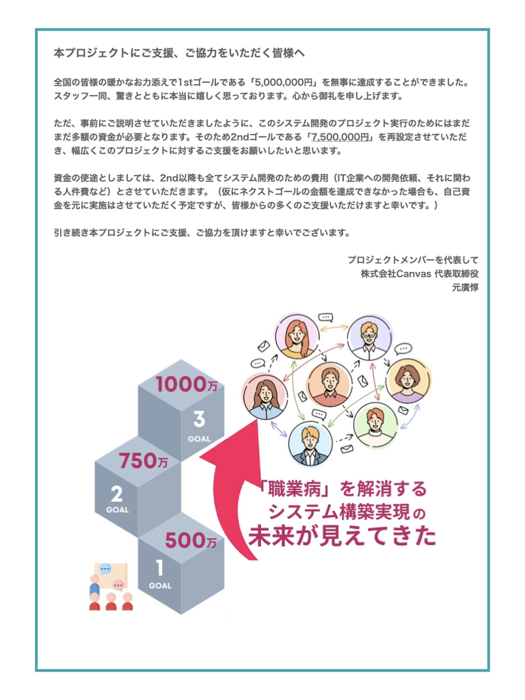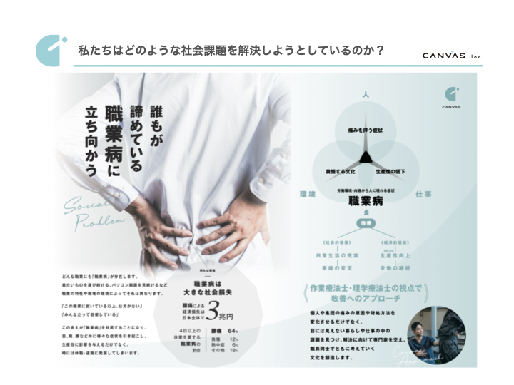 株式会社CanvasがIT企業とともに職業病改善のシステム開発を行う。2024年4月からプロジェクトをスタートする予定。それに必要な契約金約2000万をIT企業に、人件費・研究開発費に約1000万をそれぞれ活用する予定。