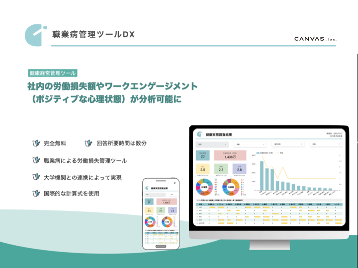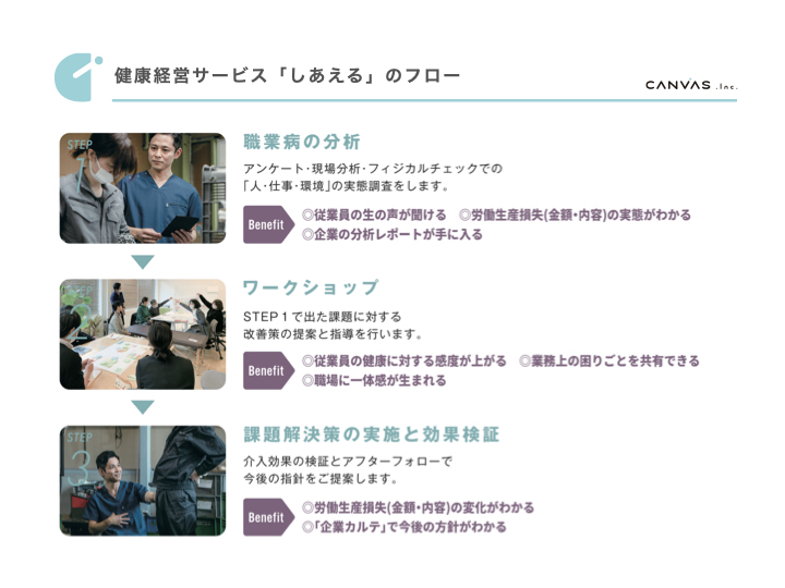 「しあえる」では職業病による会社の経営上の問題(健康問題によりどれくらい会社に損失額が生じているのか)を可視化したり、企業の働く現場を様々な専門家チームで分析することで、根本的な職業病の解決に向かいます。