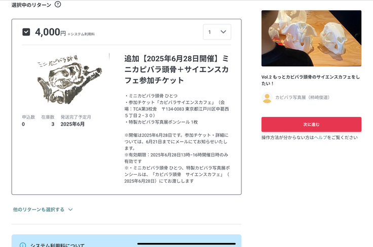 「ミニカピバラ頭骨+サイエンスカフェ参加チケット」をご支援いただき、ありがとうございます。