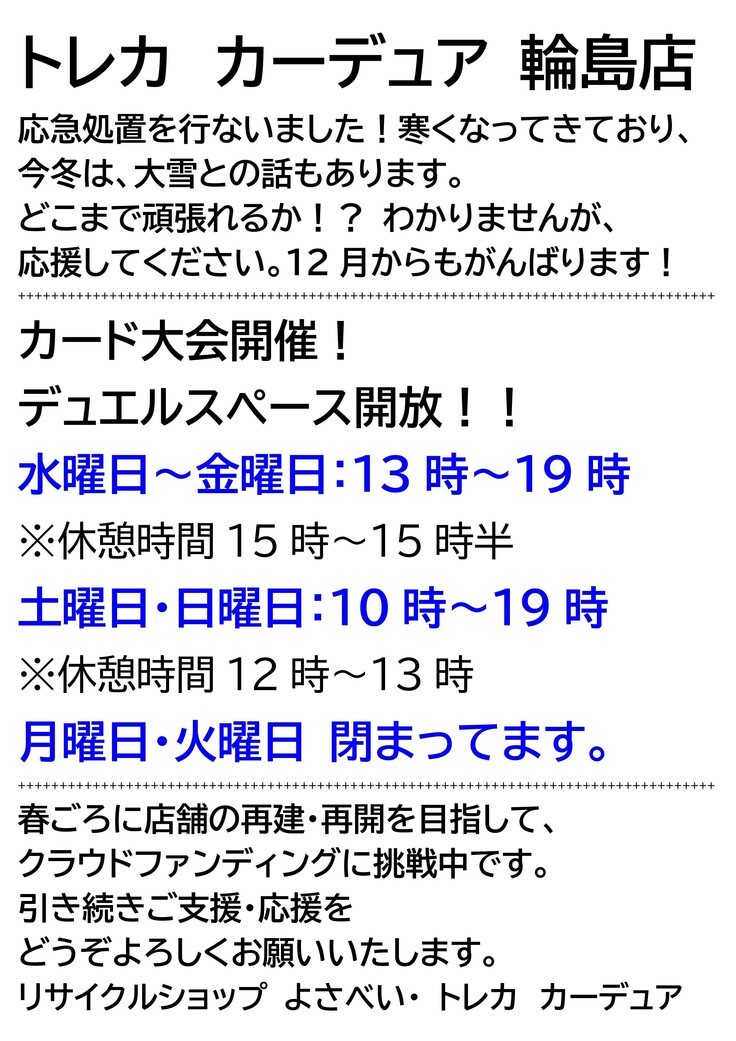 12月からもお店を開けます! 新商品の販売/ カード大会開催します。 トレカ カーデュア 輪島店