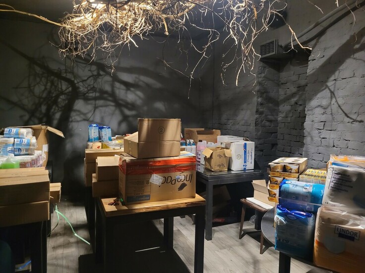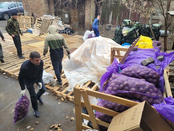 キーウにあるコーヒーショップは、周辺地域の人々に対して、1日約11,000食を提供するボランティアネットワークの本部になっています。この日は、支援物資として届いたばかりのジャガイモの袋詰めが行われていました。ここには約500人のボランティアと100人のドライバーがいます。
