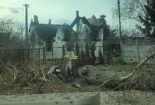 キーウに近づくほど、破壊された建物が多く見られます。完全に破壊されたガソリンスタンドもあれば、部分的に崩壊していたり、ミサイルの穴があいていたりする住宅もあります。破壊された家を見るたびに、誰かがかつてここに住んでいたのだと思います。おそらく、子ども連れの家族や、余生を楽しみたいと思っていた老夫婦です。