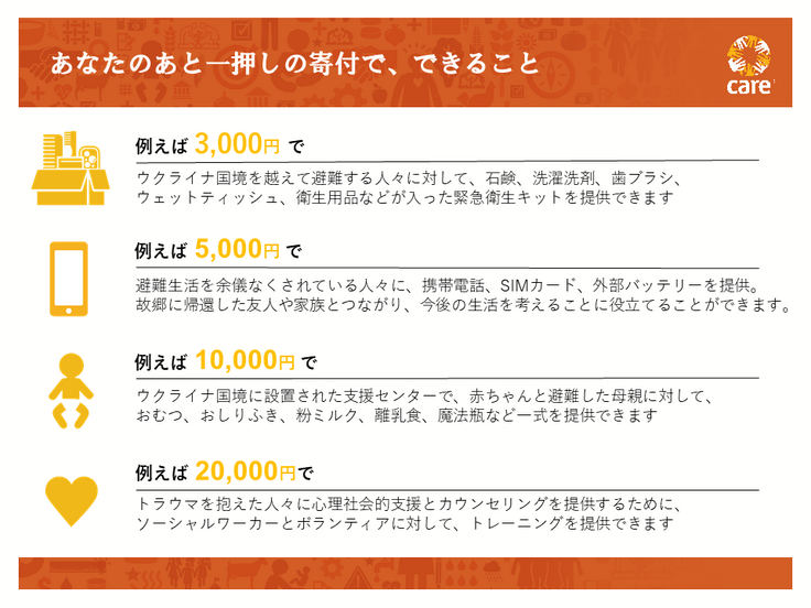金額の多寡にかかわらず、皆さまからのご支援を、確実にウクライナの人々が今必要とする支援に変えて、届けます。どうか、私たちに皆さまのお気持ちを託してください。