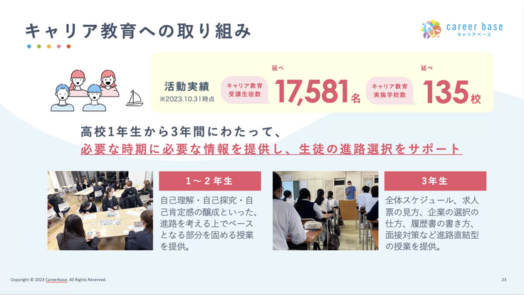 高校1年生から3年間にわたって、必要な時期に必要な情報を提供し、就職に限らず生徒の進路選択全体をサポートしています。