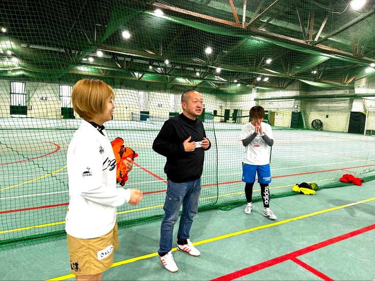 フットサル場に着くと「こんにちは!よろしくお願いします!」とフレッシュに挨拶する生徒たち🌞着替えて名前を書いたガムテープを貼って、コートに集まり自己紹介をしていきます。