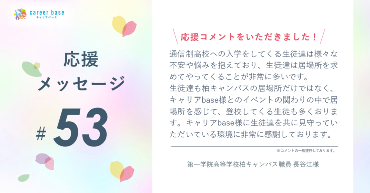 さて、今回の『応援メッセージのご紹介』は、第一学院高等学校柏キャンパス職員 長谷江様よりいただいたメッセージをご紹介いたします✨