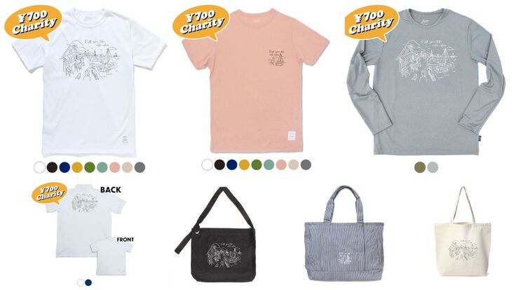 Tシャツだけでなく、ロングTシャツやポロシャツ、トートバック、ランチバックなど小物もございます。大人サイズ、キッズサイズとあり、デザインも2パターンあります。