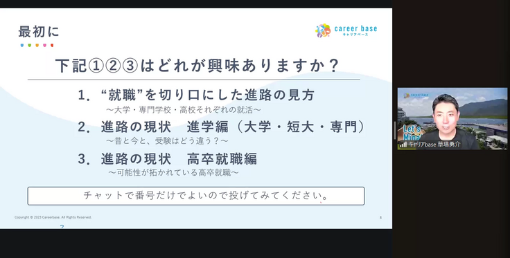 そんな時期に合わせて、先日キャリアbase代表の草場が講師を務め、保護者の方々を対象としたオンラインセミナーを実施しました。
