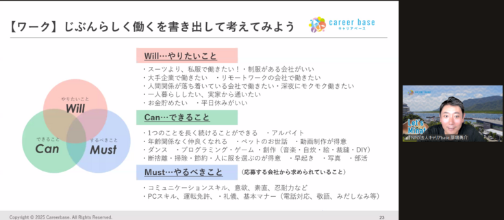 今回は自分を見つめるワークとして、「WillCanMust」のフレームワークを使って、自分らしく働くを考えるワークに取り組んでもらいました。
