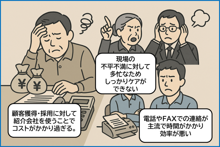 しかしその運営では、依然として電話・FAX・紙書類といったアナログ業務が負担となり、人材紹介や集客にも大きなコストがかかっています。