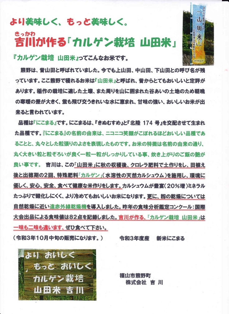 ◆広島県福山市熊野町産「カルゲン栽培 山田米」株式会社吉川様