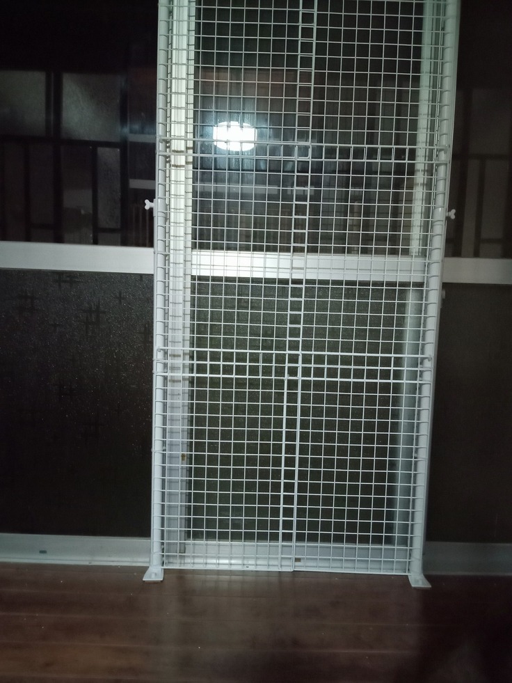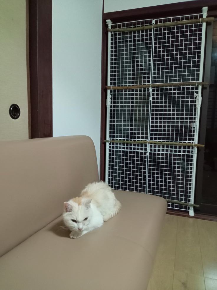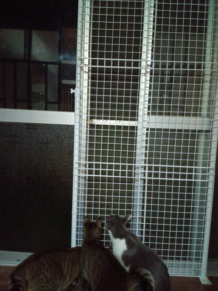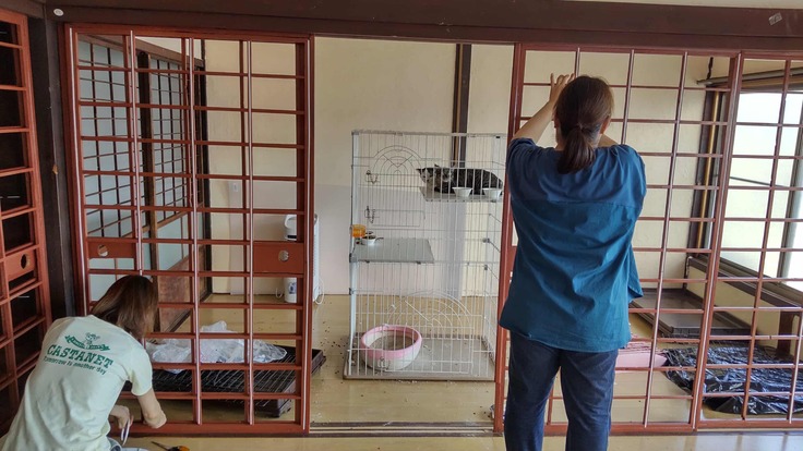 骨だけの襖ごしに見えるケージには「おかき」と「せんべい」隔離中。