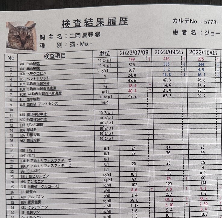 ごはんはモリモリ食べるので、前回から体重は2.8kg➡2.95kgに増えたものの、腎臓病から起こる貧血の項目は前回よりも数値が悪くなっていました。(2枚目ヘモグロビンの項目)