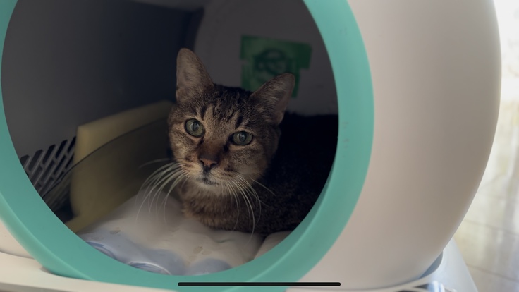 (ご支援者様からお譲りいただいた自動トイレ(カフェで使用予定)をおうちと勘違いして立てこもるジョーくん)