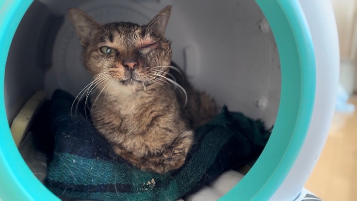 目の上部分から皮膚を破って膿が出ていたジョーくんですが、抗生剤注射や造血剤注射を乗り越え今日まで痛みに耐え抜いてくれました。