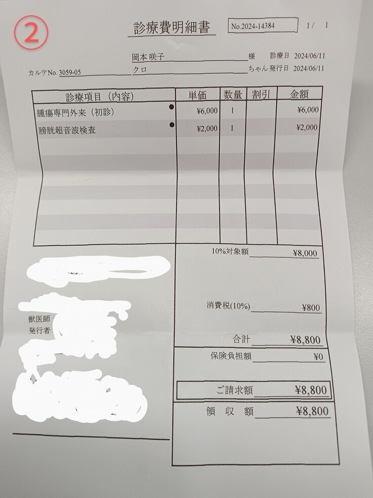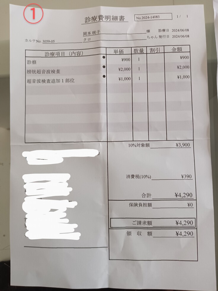 診察検査代 診察代、尿検査、エコー、尿検査外注で16000円程度だったが、破棄してしまい領収書なし。