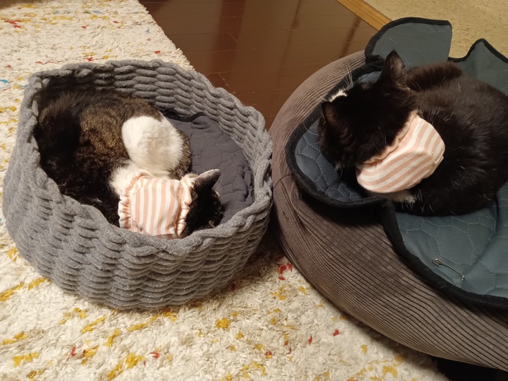 写真は、こうめも食道チューブいれたので、くーちゃんとこうめ、おそろいの巻き巻き。