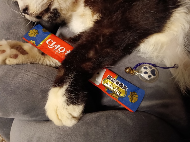 さみしくないように、私が持っていたお守りと、おなかすかないように大好きなちゅーるを持たせました