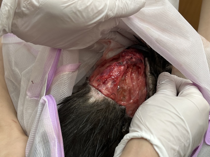 傷口の洗浄とドレッシング、抗生剤を投与してもらいました。事故か何かで傷を負った可能性が高いこともわかりました。人の手によって故意に傷つけられ、怖い思いをしたのではないことがせめてもの救いかもしれません。