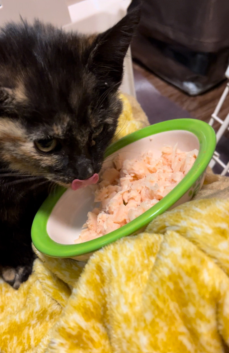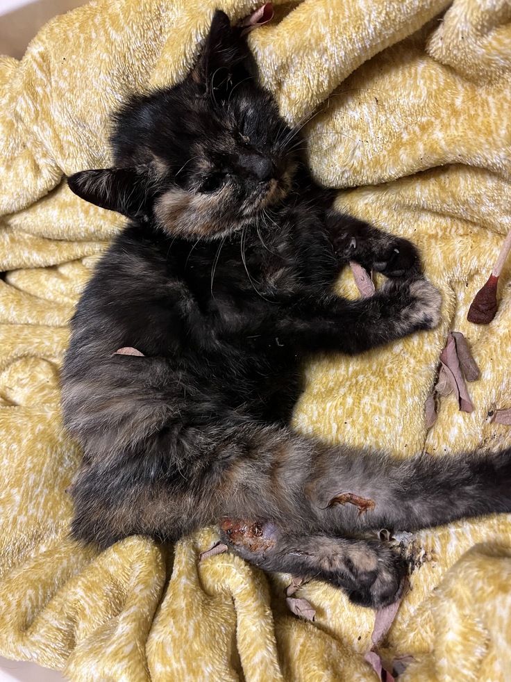 子猫は両脚にひどい怪我を負っていましたが、フードを差し出すとガツガツと一気に食べる姿を見て一安心。