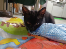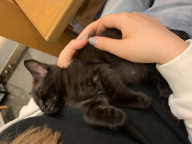 保護直後に比べると、子ネコの体重は増えひかりも私たちにたくさん甘えてくれるようになりました。子ネコの風邪症状も大分和らぎ、目も完全に開くように。