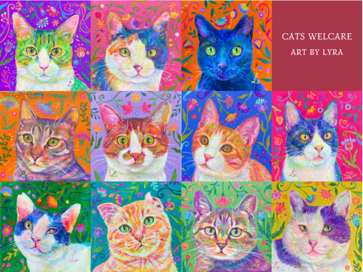 私は保護猫の支援を軸にした絵を描く活動を行っており、絵を依頼してくださるお客様にも支援に参加していただけるよう、売り上げの一部を寄付しています。保護猫たちの可愛らしさやポジティブなイメージを広めたいという思いも込めています。