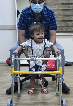 ダウン症に加えて四肢の筋力が弱く、まだ一人で歩け