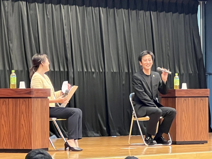 日頃会えない地元出身の俳優さんという事もあり、参加した生徒の皆さんは真剣に耳を傾けてくれていました。質疑応答の時間も積極的に手を上げてくれてくれて、もっと時間を用意できれば良かったと思う程でした。