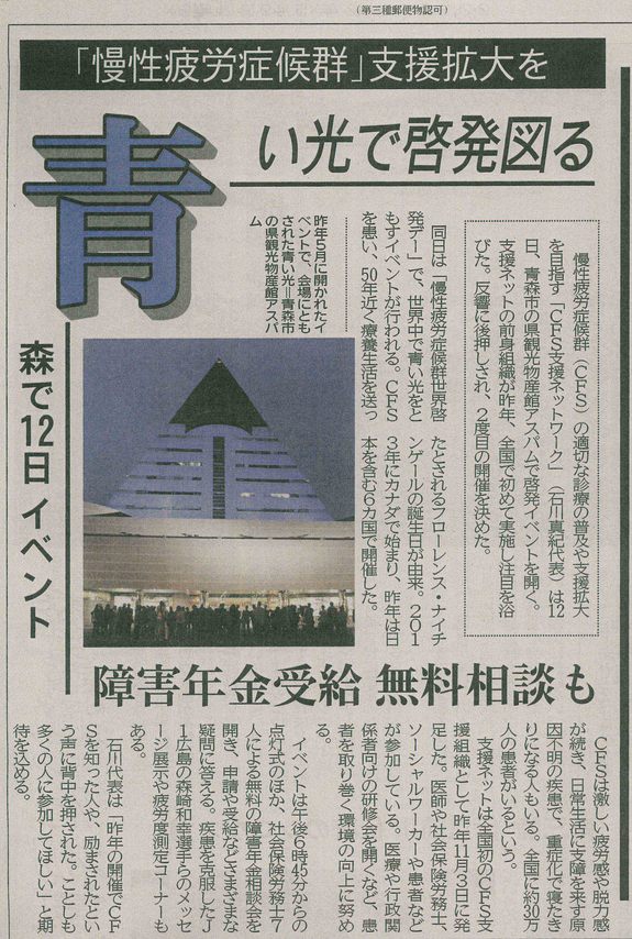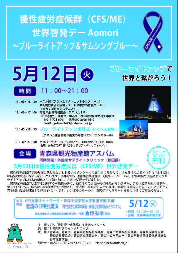 5月12日は、慢性疲労症候群だけでなく、線維筋痛症、化学物質過敏症の啓発デーにもなっています。
