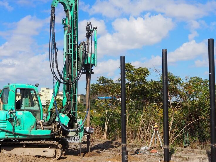 ※「基礎杭打ち工事」とは、構造物を建築するときの「基礎工事」のひとつです。構造物をつくる際、構造物からの力を地盤に伝え、構造物を安全に支える機能が必要になります。基礎杭打ち工事では、主にやわらかい地盤の上に建てられる構造物に対して使われることが多いです。この基礎杭打ち工事を行うと、地震や台風などの災害時に建物が倒壊しにくくなり、また、構造物の耐久性が向上する効果も期待できます。