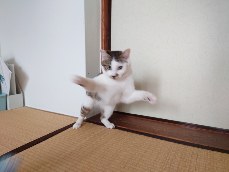 でも、最近はオモチャに興奮して飛びついたり、クッションの下に潜伏してみせたりと、とても元気な姿を見せてくれています。