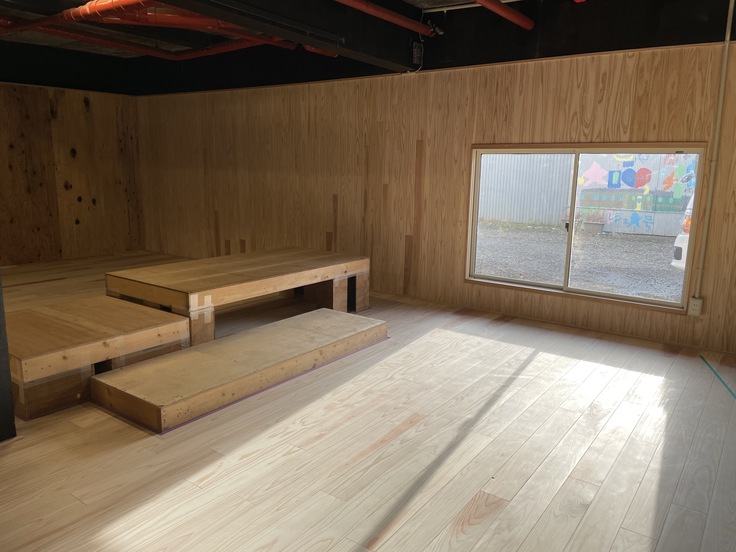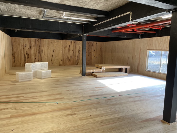 ここに宮城県の助成金を使って、壁と床の修繕を行いました。宮城県産木材を使用した整備事業に一定の割合で補助金が出るというものです。2021年の夏から工事を始め、宮城県石巻市産の杉材を使って、コンクリートの上に無垢材の床と、壁を取り付けました。