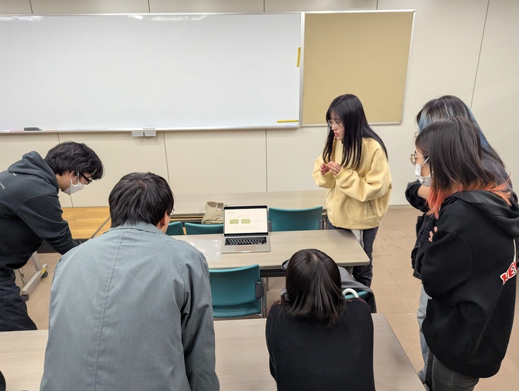 10月28日には、「人間知序論Ⅱ」の第3回目の講義が行われました。この講義では、異なる専門分野の学生が互いに自分の研究や関心のあるテーマを紹介し合い、最終的にはグループを組んで共同研究の提案を行うことを目指しています。異分野の人に自分の研究をわかりやすく伝える方法を学ぶことも、大きな目的の一つです。写真は、いくつかのグループのうちの一つで、研究紹介を行っている様子です。
