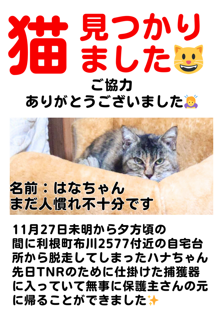 先日TNRのために仕掛けた捕獲器に入っていて無事に保護主さんの元に帰ることができまし