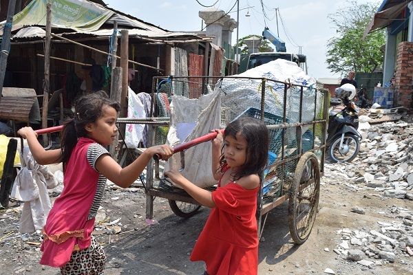 配布の後スラムを訪問すると、学校でいつも見ている無邪気な笑顔はありませんでした。真剣な表情で重いリヤカーを押して仕事をしてます。