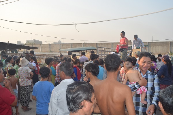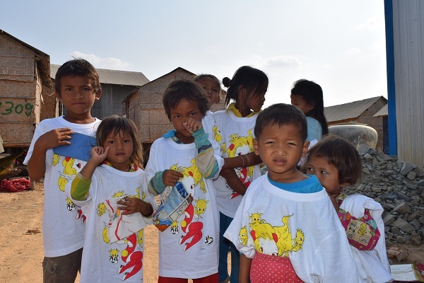 バークンから近い場所にあるスラムです。カンボジアスタッフが「是非ここにも行きたい」との希望で急きょ訪問することになりました。子供は100人くらい、男性は建築の仕事、女性は防錆工場で働く人が多いようです。仕事はあるとは言え、家族の収入は1ヶ月で2万円にもならず、子供服を買ってあげる余裕は中々ないと話してくれました。