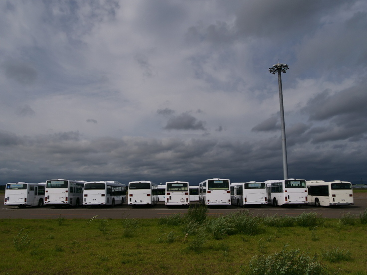 自衛隊側にバスのヤードがあるのは知りませんで、まずはズラッと並んだバスのお尻を。