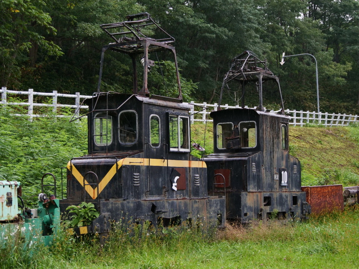 駐車場には炭鉱で活躍していたらしい機関車が無造作に置かれています。