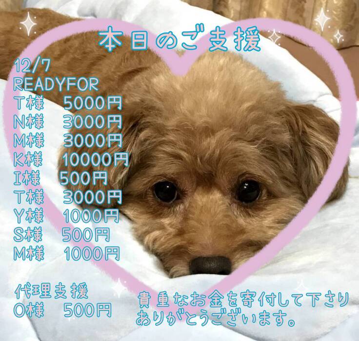 ご支援金は全て、ちゃわの手術費、入院費、通院費に充てさせて頂きますので、リターンに費用を掛けられず、申し訳ございません。